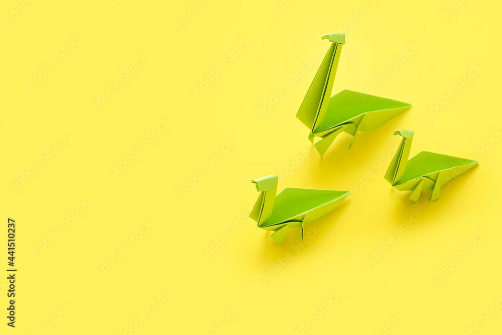 Origami dinosaurs on color background. Concept of uniqueness