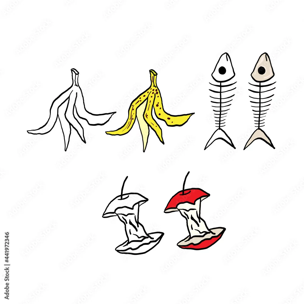 Outline and colorful elements of biodegradable food waste. Spoiled food or rotting food waste. Symbol of problem globe pollution. Cartoon hand-drawing style. Garbage and trash object.