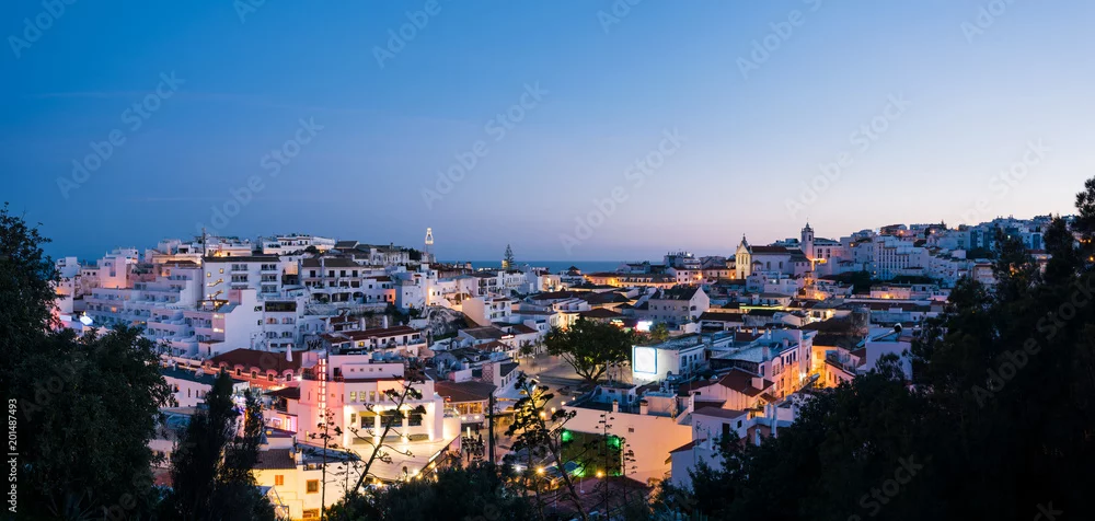Panoramic, night view of the Old Town of Albufeira City in Algarve, Portugal. Albufeira is a coastal city in the southern Algarve region of Portugal.