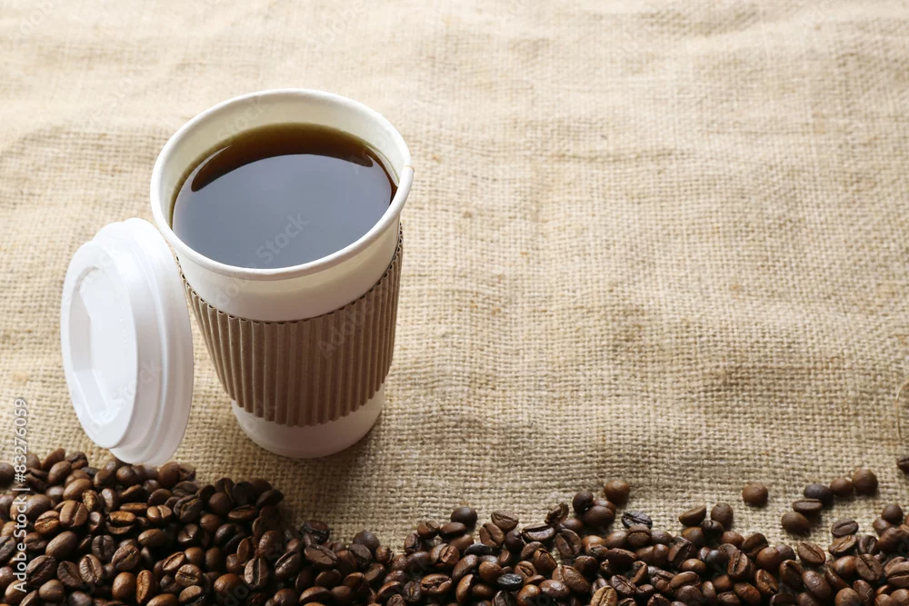 Paper cup of coffee with beans on sackcloth close up