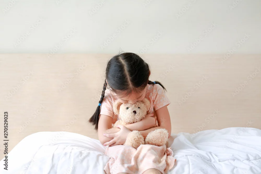 Peaceful Asian little girl embracing teddy bear while sitting on the bed at home.