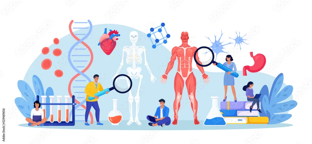 People studying anatomy of male muscular system and skeleton. Anatomical structure of human body. Medicine, physiology. Biology lesson at college. Students ...