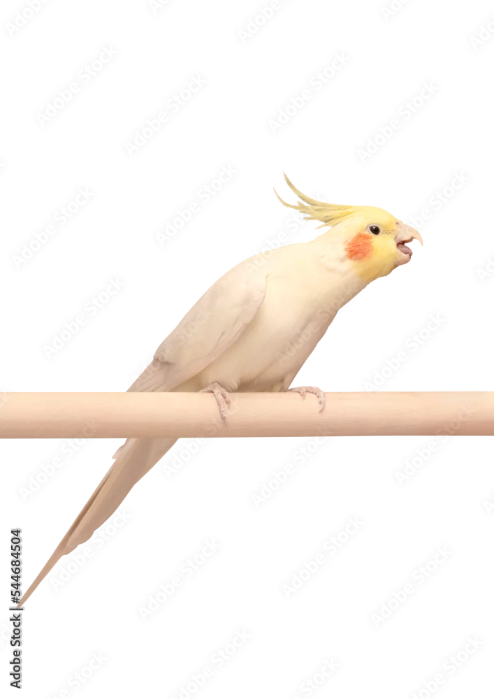Pet parrot cockatiel with a yellow crest and red cheeks opened his beak and stretches his tongue to take something in his mouth isolated on a white background. ...