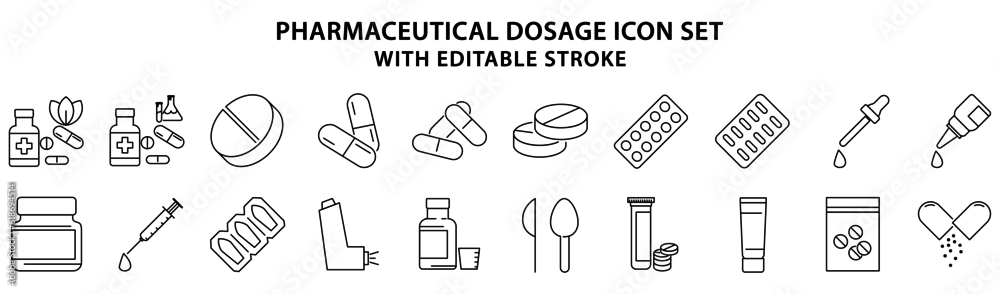 Pharmaceutical dosage icons. Set icon of pharmaceutical dosage. types of drugs icon. vector illustration. editable stroke.