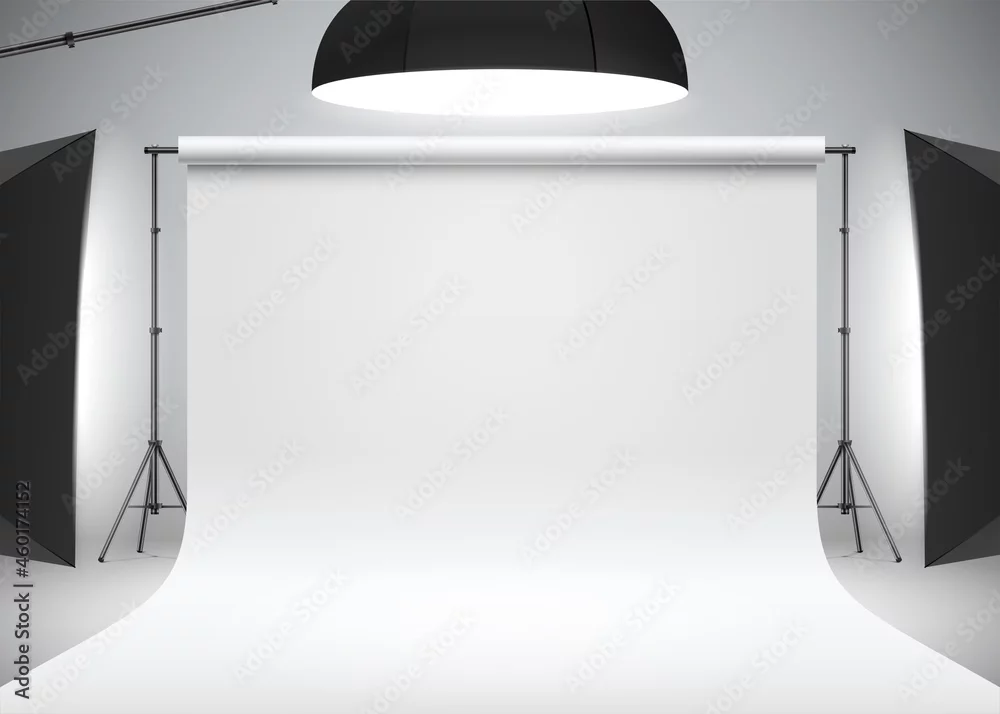 Photo studio white backdrop lit with side and head softboxes. Professional photo shooting setup with studio lights, realistic vector illustration. Studio ...