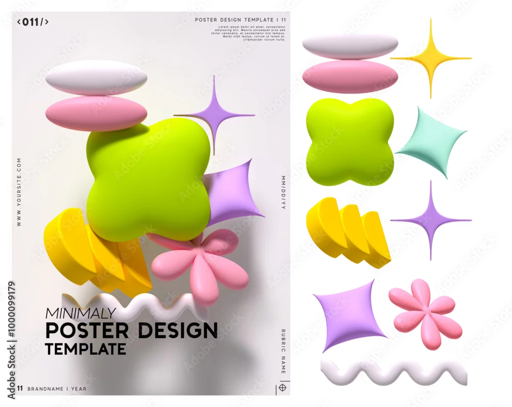 Set of colorful 3d geometric shapes, including spheres, stars, other forms, minimal modern poster design template with geometric soft blown objects of ...