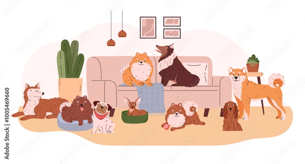 Cartoon different breeds dogs in the living room, friendly canine purebred animals on the coach, cute Spitz, collie pets