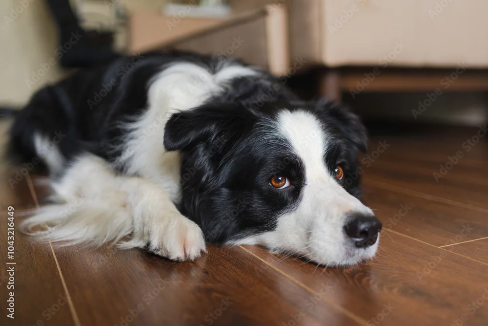 Cute puppy dog border collie lying down playing with funny face on floor at home indoors. Pet dog resting ready to sleep indoor. Funny emotional dog Love for pets friendship companion pet care