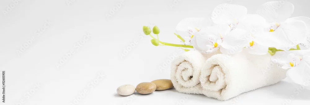 Spa orchid with soft towels and massage stones setting