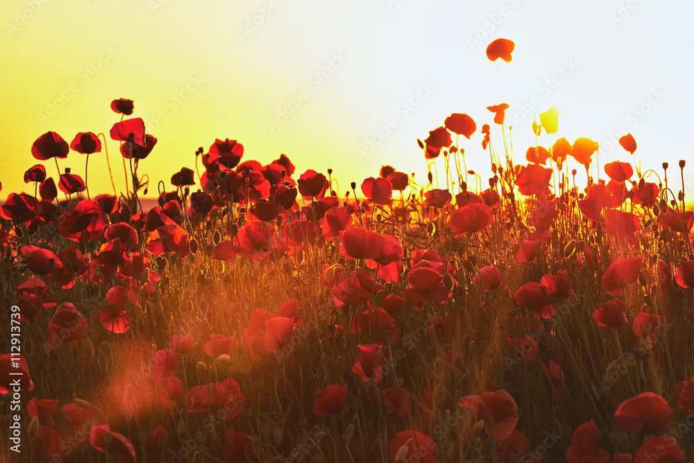 Czerwone pole maków o zachodzie słońca