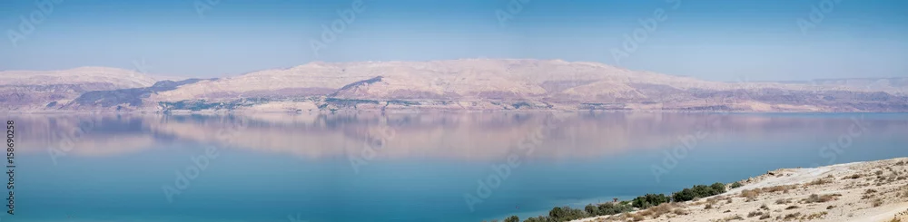 Large panoramic view of Dead sea beach at sunset. Jordan side. Shot taken from israeli side