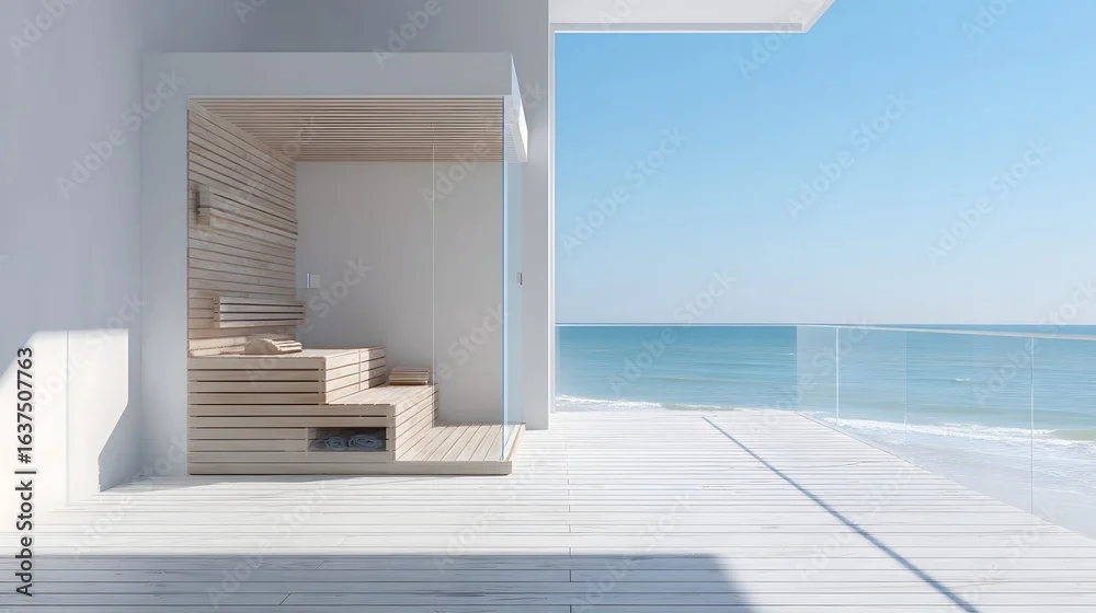 Modern light-colored wooden sauna on a seaside deck.