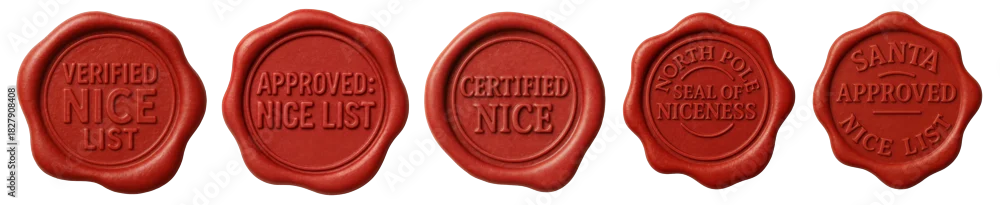 Set of red wax seals for Santa’s nice list with North Pole approval and certified Christmas stamp designs