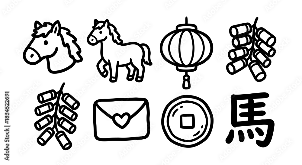 Chinese New Year vector illustration icon set featuring hand drawn doodle horse and festive elements