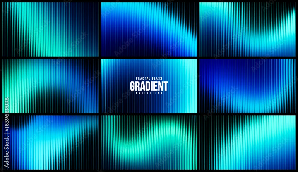 Set of futuristic neon fractal glass backgrounds with vibrant blue wavy gradients. Dynamic series of neon blue gradient backgrounds shaped by ribbed fractal ...