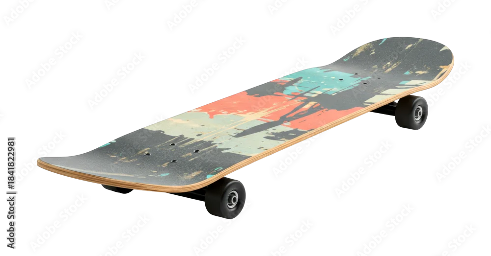 Modern skateboard with a vibrant abstract grunge design showcasing its unique graphic art and durable construction for urban sports and recreation.