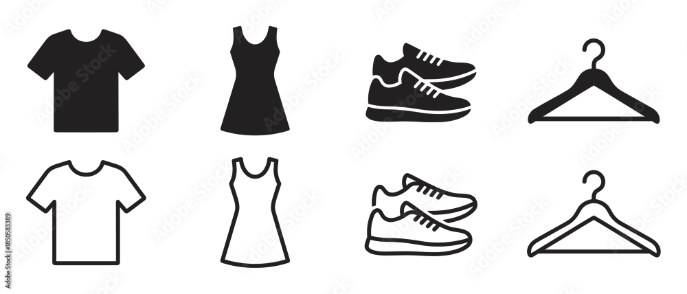 Black and white clothing icon set featuring a t-shirt, dress, sneakers, and hanger in both solid silhouette and simple outline styles for user interface ...