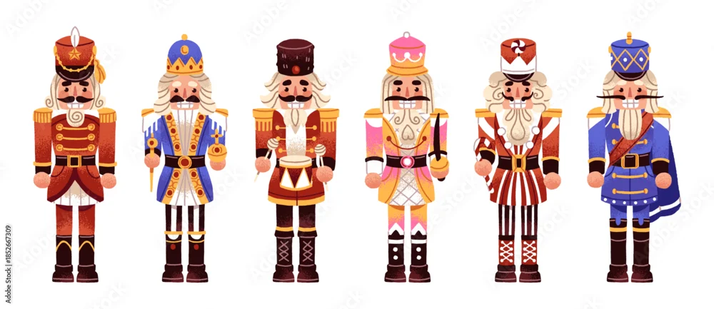 Christmas nutcrackers set. Xmas children's toys. Designs of wooden figurines of winter holidays' character. New Year's soldiers with mustaches. Flat isolated ...