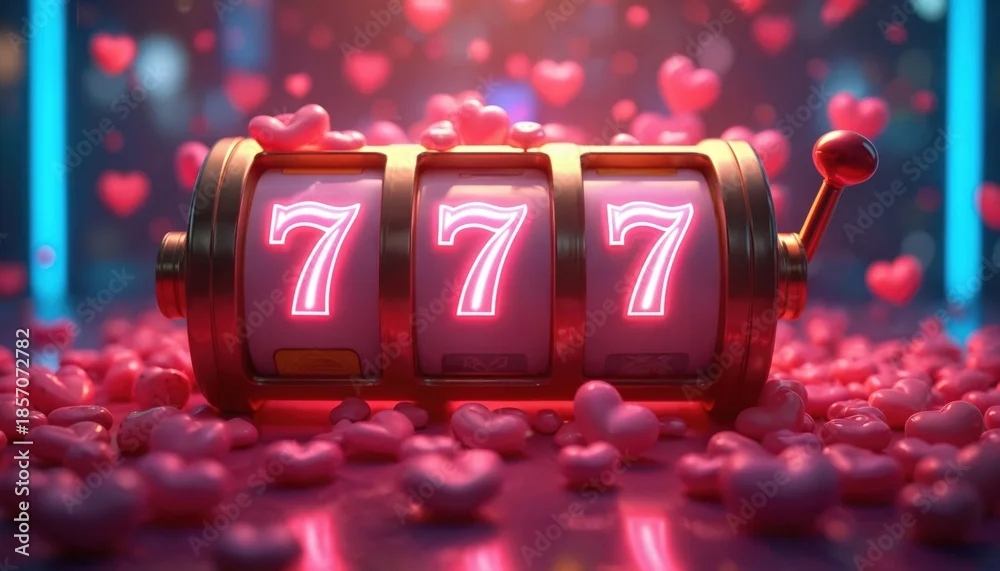 Golden slot machine with three sevens spins jackpot. Pink hearts surround machine. Neon lights glow bright. Festive gambling atmosphere excites players. ...