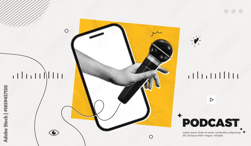 Trendy Halftone Collage Online Podcast. Mobile phone with Hand holding studio microphone. Talk show and interview. Streaming service. Audio recording. ...