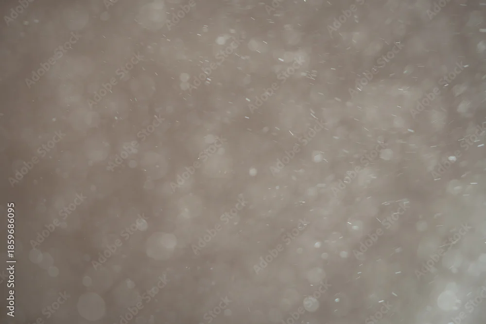 White particles or snowflakes falling diagonally on a light soft background with a motion blur effect.