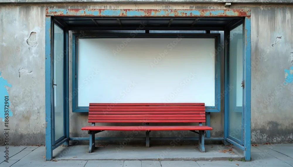 Modernist bus stop shelter with empty advertising panel. Red bench invites passerby to rest. Urban public transport waiting zone has glass walls.