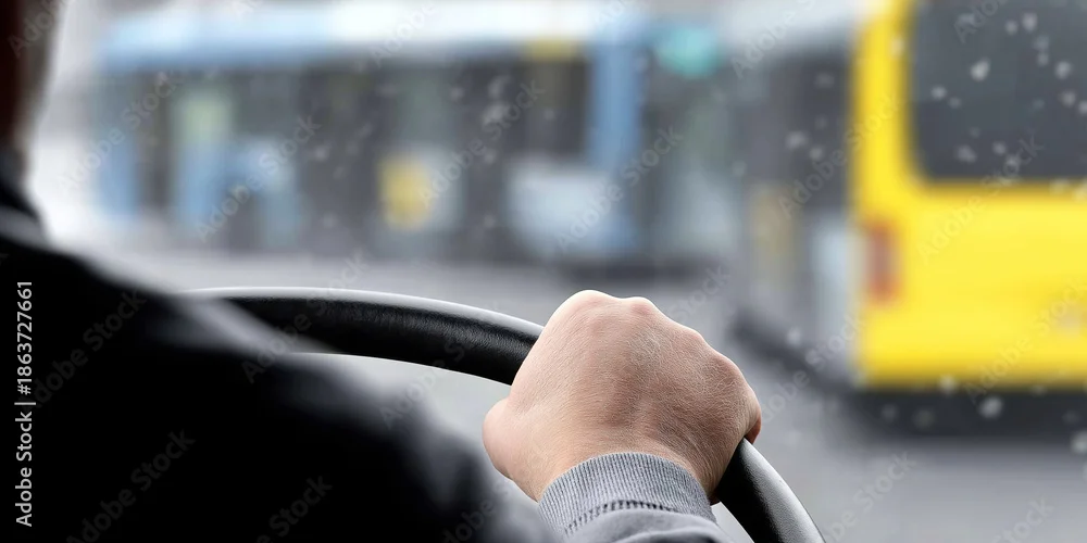 Bus driver holding steering wheel, navigating traffic and blurring city streets in light snowfall