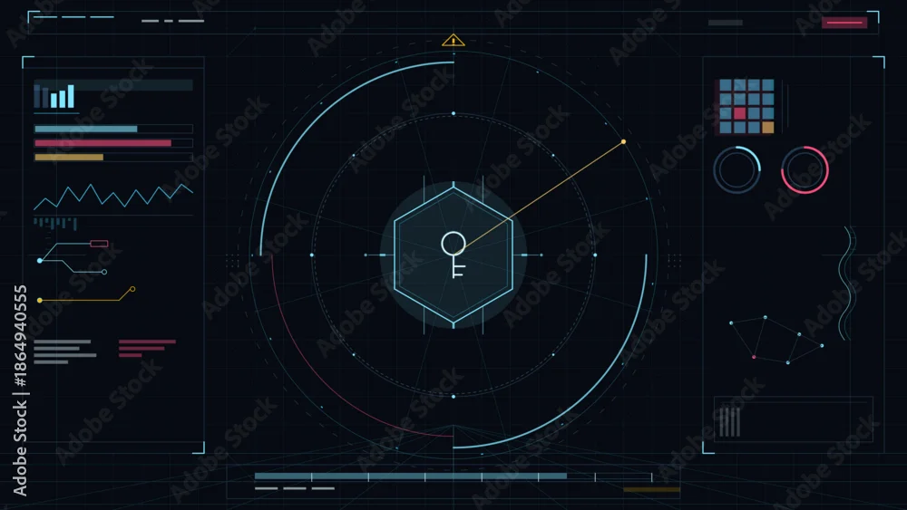 Digital interface displays data readings and metrics for an unknown system while highlighted elements point to specific values and warnings