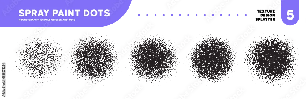 Dissolve spray dots with stipple dust effect. Circles with gradient gradation and spray texture. Abstract dust grainy round shapes. Aerosol vector airbrush effect. Dotted grunge graffiti circles.