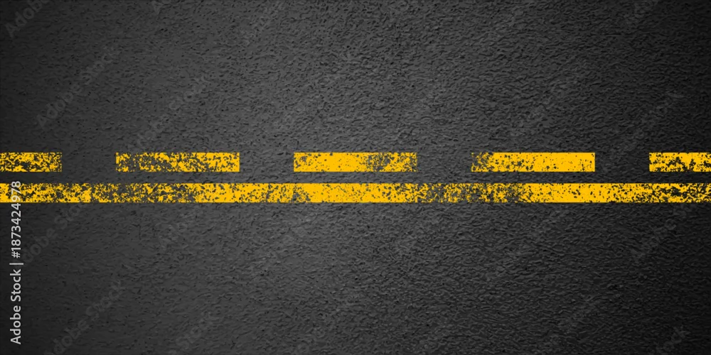 Asphalt road with yellow lane marking, concrete highway surface, texture. Street traffic line, road dividing strip. Pattern with grainy structure, grunge stone background. Vector illustration