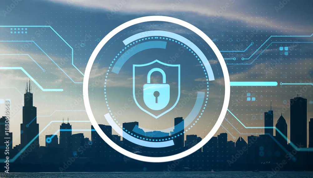 Cybersecurity lock symbol over digital interface and modern city skyline at dusk, representing urban data protection and digital safety concepts.
