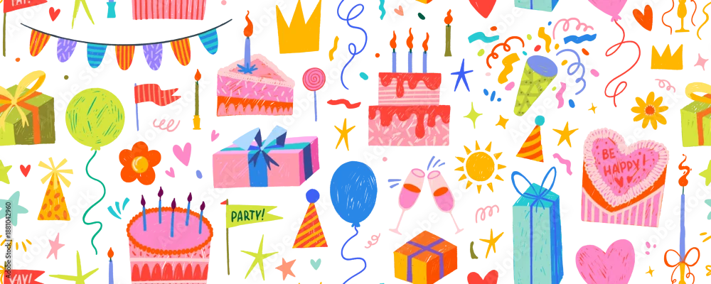 Colorful Birthday seamless pattern with crayon drawn gift boxes and cakes. Happy Birthday texture background with cute childish illustration, girly or ...
