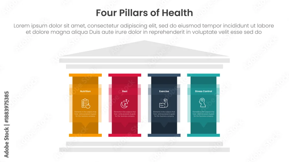 4 pillars of health infographic template banner with big pillar with text description for slide presentation vector