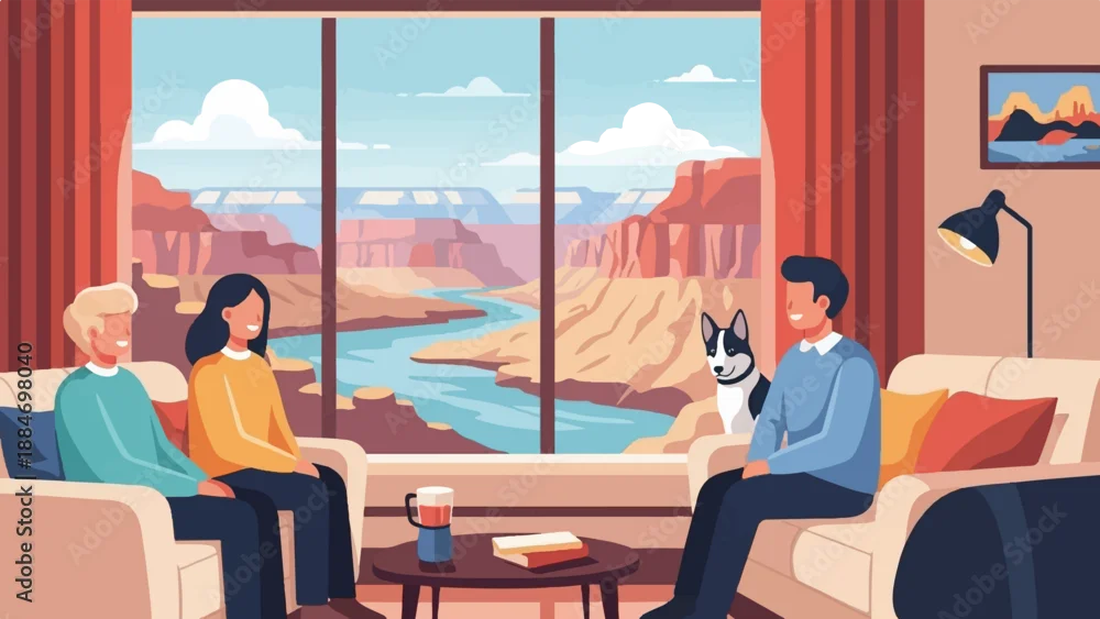 Cozy indoor scene with people, dog, and a stunning canyon view