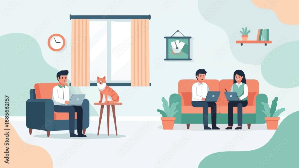 Diverse individuals work remotely from cozy living rooms with pets and plants