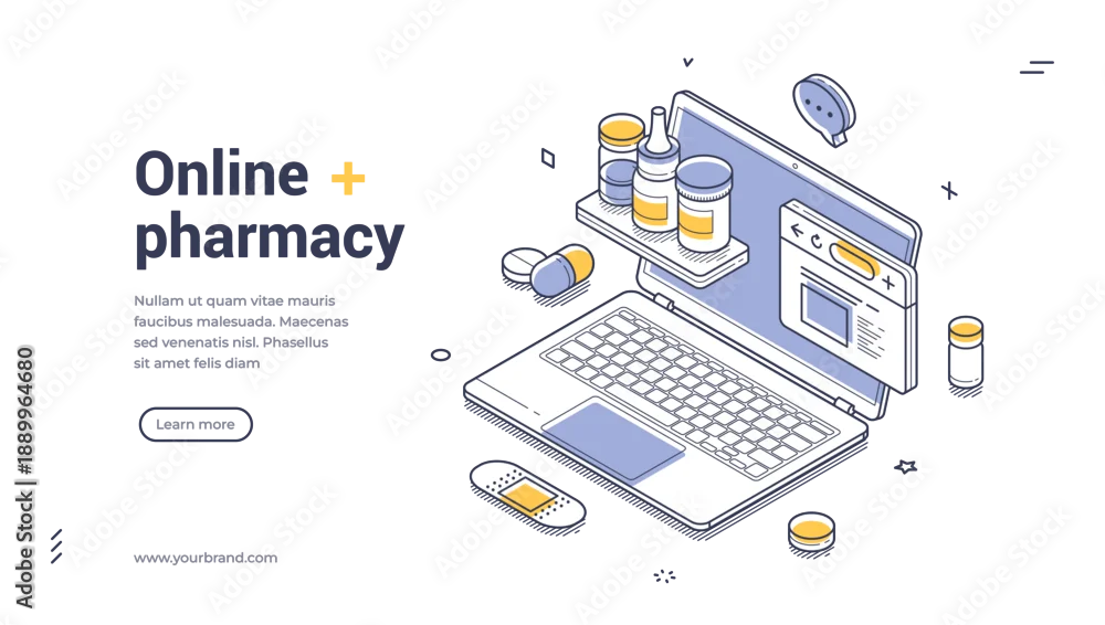 Online pharmacy web banner. Isometric template for a landing page on e-commerce medicine. Vector illustration with laptop and pills for a healthcare service ...