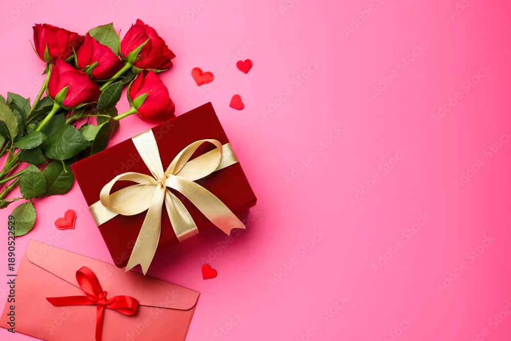 Beautiful velvet gift box, love letter, roses and decorative hearts on pink background, flat lay with space for text. Valentine's Day