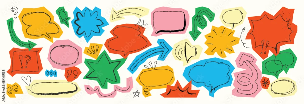 Hand drawn colorful speech bubble doodle vector set with chat icons, thumbs, labels and comic marks on white background. Fun design elements for apps, ...