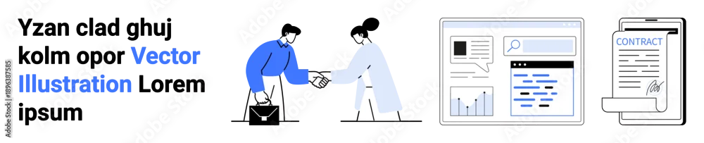 Business collaboration, workflow automation, data analysis, digital processes, online agreements, remote work. Professionals shaking hands, analytics dashboard and contract document. Business