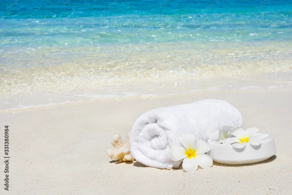 White spa towel and flowers on sandy tropical sea beach