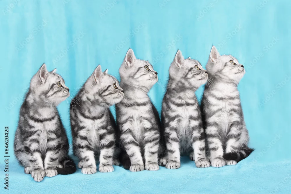 Fünf Britisch Kurzhaar Katzen blicken seitlich hoch