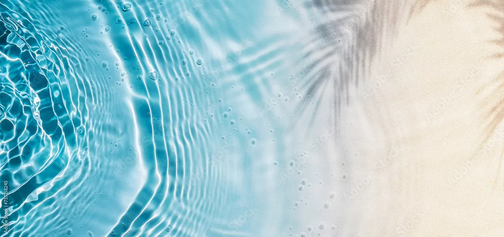 abstract sand beach with palm leaf shadow and blue water wave from above, summer vacation outdoors in tropical paradise nature, background with space