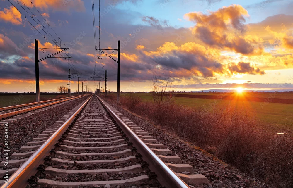 Orange sunset in low clouds over railroad