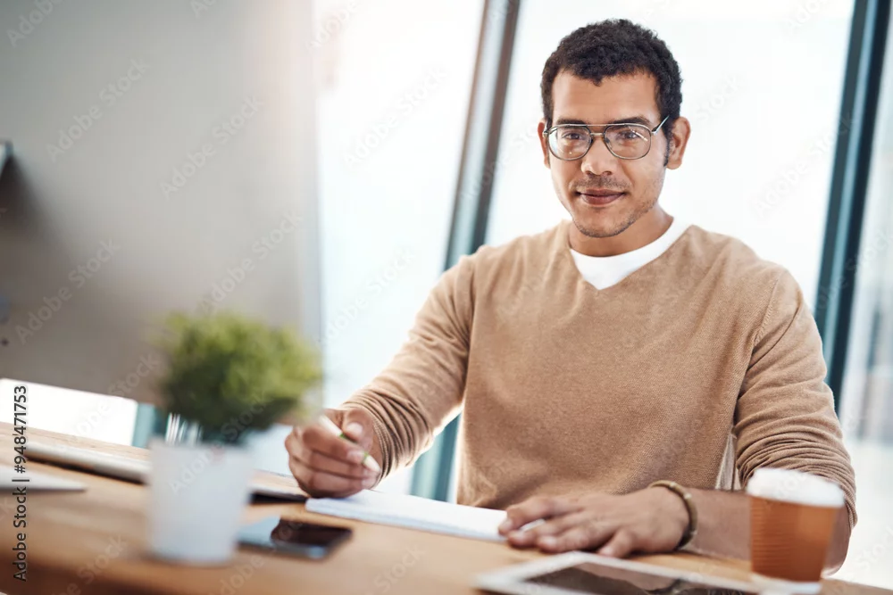 Businessman, computer and portrait for writing notes, planning and drawing sketch with glasses. Graphic designer, technology and design in office for digital ...