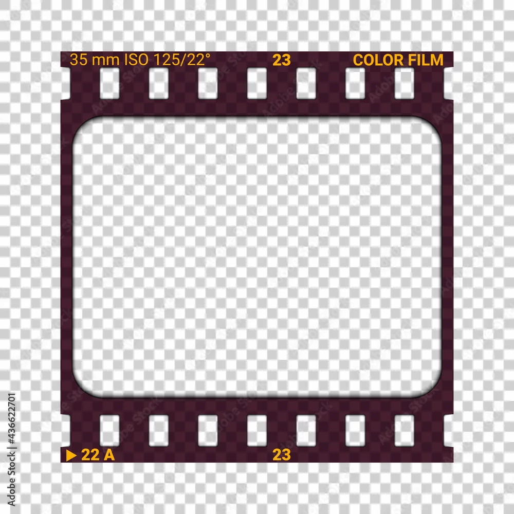Photographic film slide. Realistic vector illustration with shadow on transparent background. Blank vintage photo frame. Individual sheet of transparent film with double perforations, 35mm width.