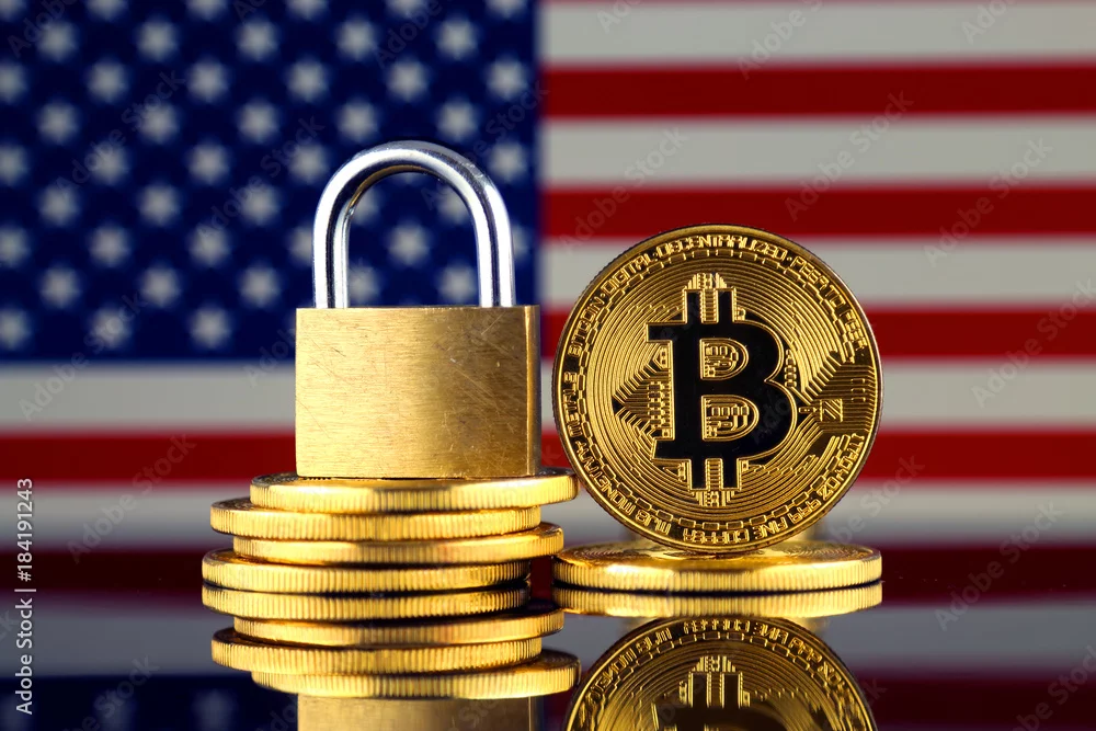 Physical version of Bitcoin, golden padlock and United States Flag. Prohibition of cryptocurrencies, regulations, restrictions or security, protection, ...
