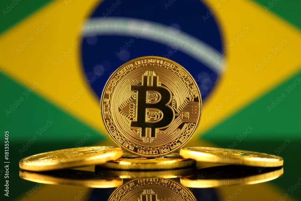 Physical version of Bitcoin (new virtual money) and Brazil Flag. Conceptual image for investors in cryptocurrency and Blockchain Technology in Brazil.