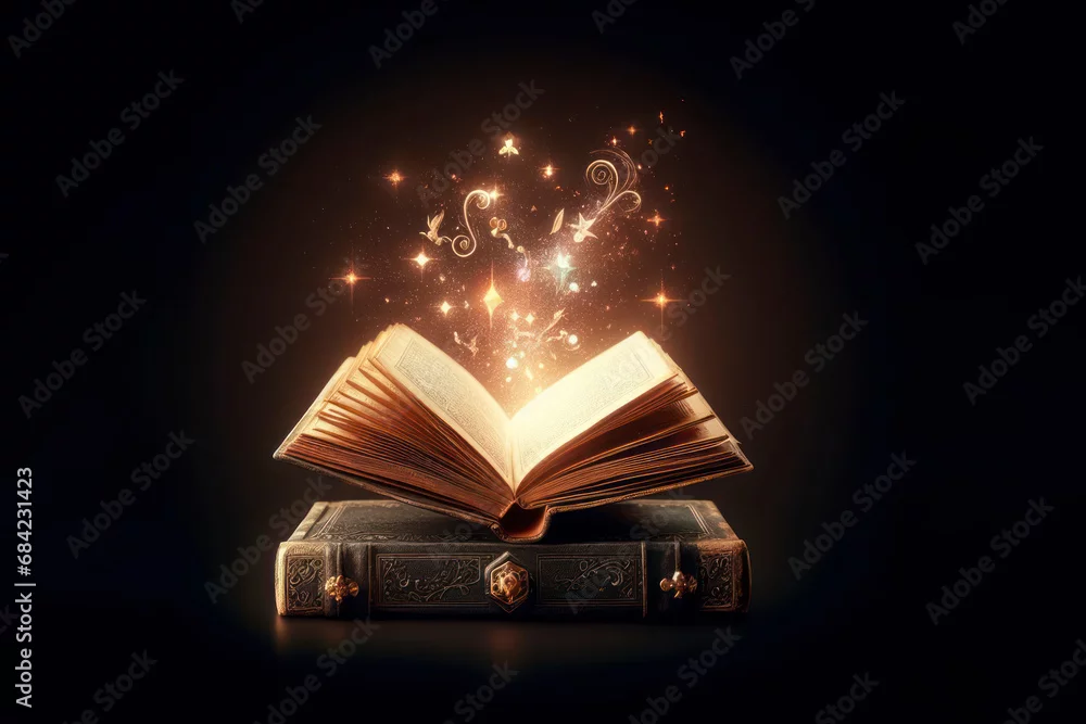 picture image of magical open book with spell for dark magic black background. ai generative