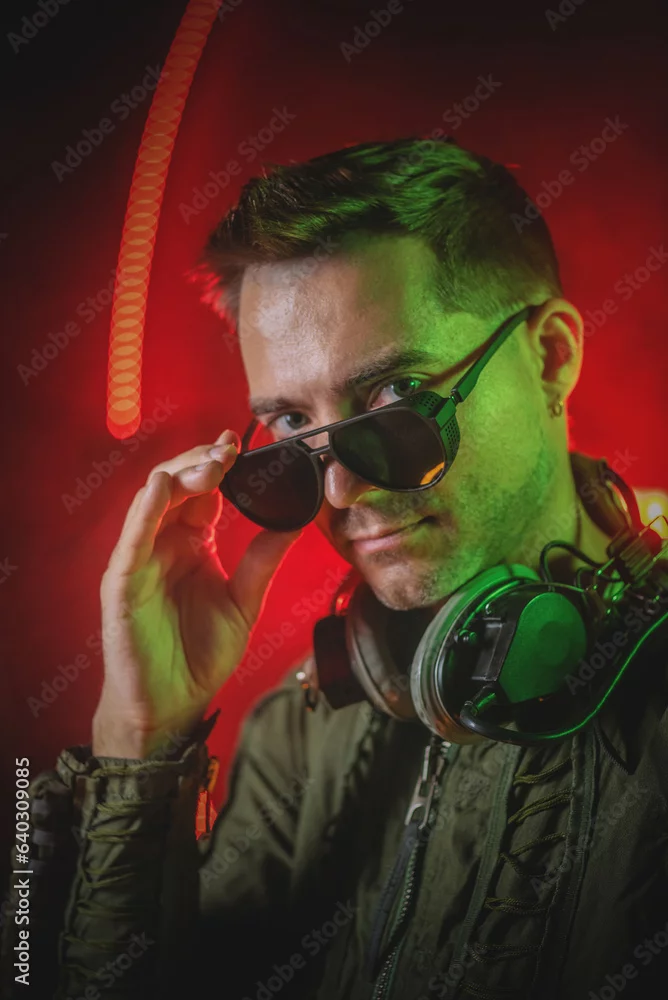 Pilot man concept. The man in the high altitude compensating suit posing on the old iron industrial fan background.