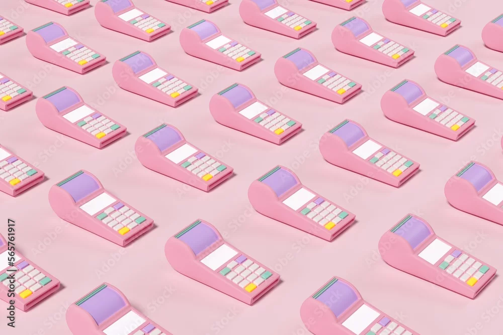 Pink POS terminal for payment with check paper receipts on a pink background Different from others. 3D shapes, isometric illustrations.